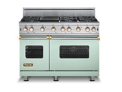 FeaturesSureSpark(TM) Ignition System From low to high, the exclusive SureSpark(TM) ignition system lights every time.VSH(TM) Pro Sealed Burner System Cook like a pro with up to 18,500 BTUs and infinite settings of easy-to-clean high performance sealed burners. Combination of unique patented burner and surface design provides cleanability plus superior performance at anyVariSimmer(TM) The VariSimmer(TM) setting on Viking gas surface burners allows for precision control of ultra-low cooking temperatures.Porcelainized Cooking Surface Keep spills in one place with the raised edges of our exclusive one-piece tooled porcelainized cooking surface. Raised edges around perimeter seal top to completely contain spills. Porcelanized for easy cleaning, durability aGourmet-Glo(TM) Infrared Broiler Lock in all the savory juices of even the thickest porterhouse with the intense heat of the restaurant-quality Gourmet-Glo(TM) infrared broiler. Intense heat from broiler sears meats and fish locking in juices. Viking VGCC5486QSABRLP: 48" Custom Sealed Burner Range, Propane Gas, Brass Accent?