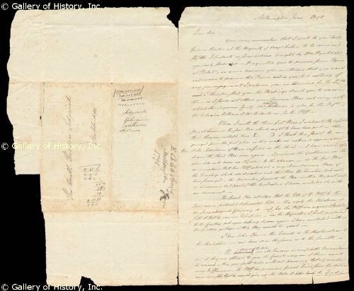 #CALEB STRONG Signed 1798 letter to Thomas Sedgwick, telling him that farmers that he represents could be ruined if forced to honor a contract Autograph letter signed "Caleb Strong". 2 pages, 8x13½ (one sheet folded, front and verso). Northampton, Massachusetts, June 1798. Addressed to "The Honble Thomas Sedgwick" in Stockbridge. Letter in regard to three pleas in a suit "Wm. Wynkoop against Hall & al." In part: "The signers of the notes are all farmers in comfortable circumstances but if they are obliged to pay the Contracts every one of them would be ruined. They gave solid notes without knowing that it made any difference. The Pltff has promised several times since the actions were brought that he would give up the notes and take back the Deed, and they have expected it would be filled without a Trial, but the last time he was applied to he said that altho he knew the notes ought to be given up, his Partners were unwilling to consent to it, and threatened to make him pay their part if he did it, & therefore he could do nothing about it." This letter was written between Strong's stints as Massachusetts senator and governor. Strong (1745-1819, born in Northampton, Massachusetts) was one of his state's first two U.S. Senators (1789-1796) and served as Governor of Massachusetts from 1800 to 1807 and 1812 to 1816. In his first seven one-year terms, Governor Strong concentrated on creating a penitentiary system and restructuring the Commonwealth's court system. Strong's later four one-year terms were highlighted by his refusal to release the Commonwealth's militia for service against Great Britain in the War of 1812. Governor Strong opposed the war, and as a framer of the U.S. Constitution he argued that governors have the prerogative to determine how and when their militias will be deployed. Lightly toned, soiled and stained. Left corners of first leaf and... For more information contact HistoryForSale. DOCUMENT 262874