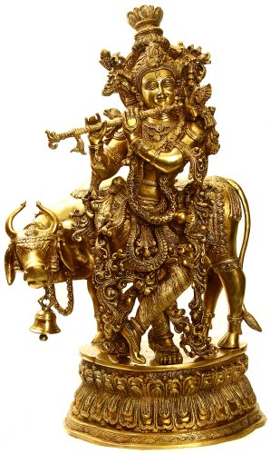Lord Krishna with a Cow and His Flute - Brass SculptureBrass Sculptures: Buy Ganesha, Buddha & Nataraja Sculptures | ExoticIndia Brass Sculpture Exceptionally ornate cast in brass, as lustrous and worked with as fine details as an image cast in gold : the same minuteness and precision as define a piece at a goldsmiths workshop, the statue represents Lord Krishna playing fully absorbed on his flute. Hearing the melody a cow is drawn to him and stands supporting him from behind. Halebid in the countrys southern part had a highly ornate style of divine images, Krishnas in particular; however, with a widely different character this image is more akin to north Indian metal casting. Iconography and anatomy of Krishnas figure as also the form and features of the cow are characteristically north Indian. Even the tri-bhanga tri-curved posture is a more celebrated form of Krishnas images in north. The popular term for tri-bhanga being banke this form of his image is widely known as Banke Bihari and enshrines the most significant of his pithas seats, the Vrindavana shrine.One of the most popular styles of his idol combining two iconographic forms of his image usually named as Venu-Gopal : Krishna playing on his flute, and Dhenu-Gopal : Krishna with cow, an outstanding work of art in regard to representing the essential bhava : emotion, absorption of the enrapt Krishna playing on his flute and mystic dimensions of the theme, and the cows devotion, the artifact attains its rare distinction in its unique ornate character, great excellence, and power to discover even the minutest details and to inspire devotion. The presence of cow only further enhances his identity as Gopal, a term meaning the patron of cows : Go meaning cow, and pal, patron or keeper, and thus when combined, the keeper of cows; however, in Krishnas relation to cow the mystic finds cosmic dimensions. The term go also means indriya senses, the basic character of l